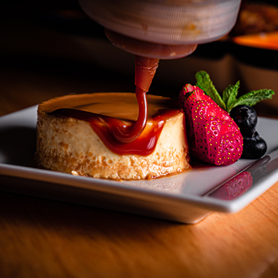 Silky vanilla custard drizzled with dulce de leche.