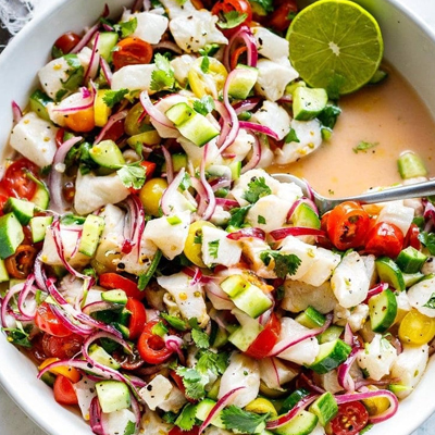 Fresh shrimp and cod pieces marinated in lime juice, topped with pico de gallo, guac and guajillo sesame seasoning. Served with house chips.