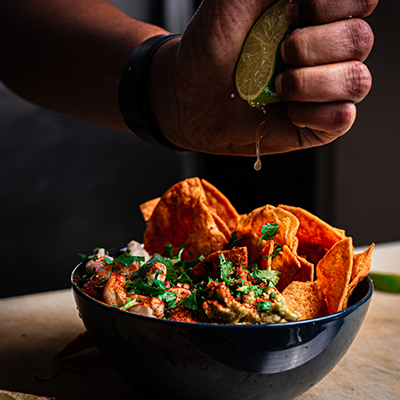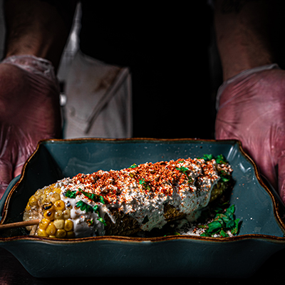 Corn Sauteed with butter and cotija cheese, drizzled with lime crema and topped with cilantro and Guajillo sesame seasoning. Served with house chips.