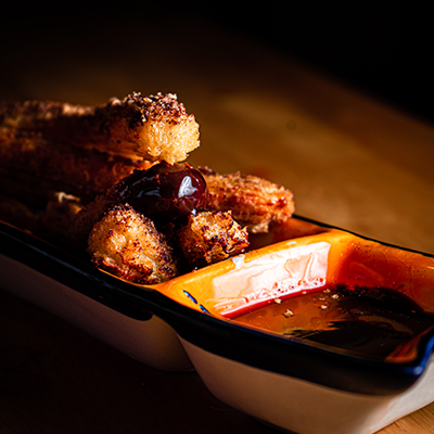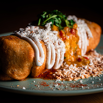 Three deep fried flour tortillas stuffed with grilled peppers and refried beans, topped with pico, lettuce and sour cream. ( add chicken - 3 | porco asado - 3 )